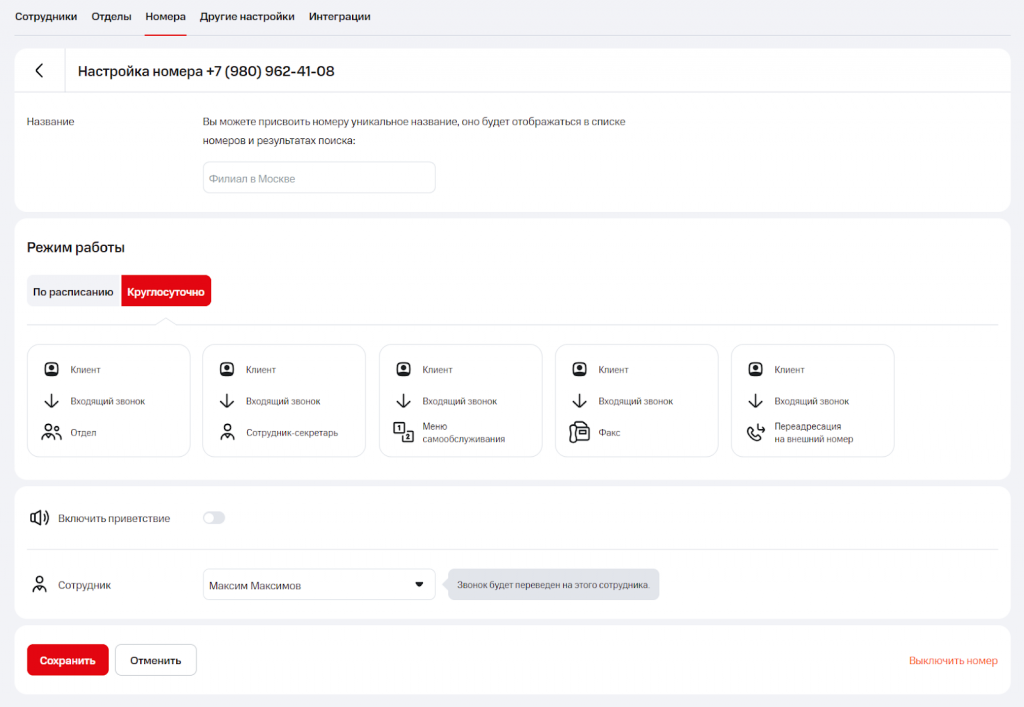 Откройте раздел «Номера» и выберите нужный номер. Затем в режиме работы установите вариант «Меню самообслуживания».