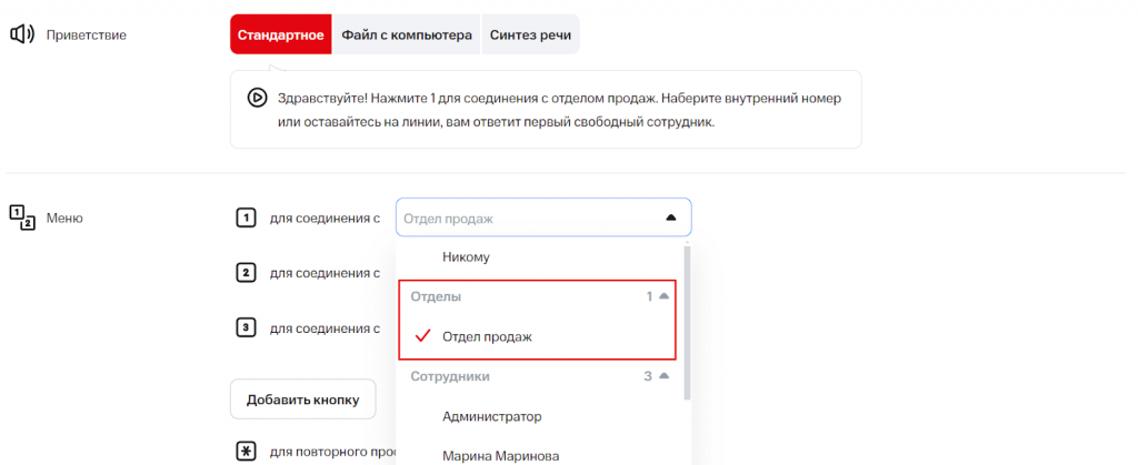 Для настройки первого уровня задайте действия для кнопок. Например: «1 — поддержка», «2 — отдел продаж», «3 — автоответчик компании».