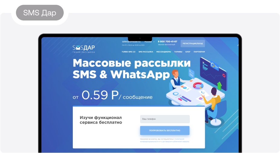 2. SMS Дар. Стоимость одного сообщения — от 59 копеек. Платформа позволяет делать рассылку во все регионы и города страны, на номера любых операторов, а через популярные мессенджеры — по всему миру. Можно бесплатно протестировать сервис, интегрировать его с рабочей программой или сайтом, приложением. В собственной базе платформы около 30 миллионов абонентов. Аудиторию можно сегментировать по возрасту, месту проживания и другим критериям. При регистрации пользователей ждут бонусы.