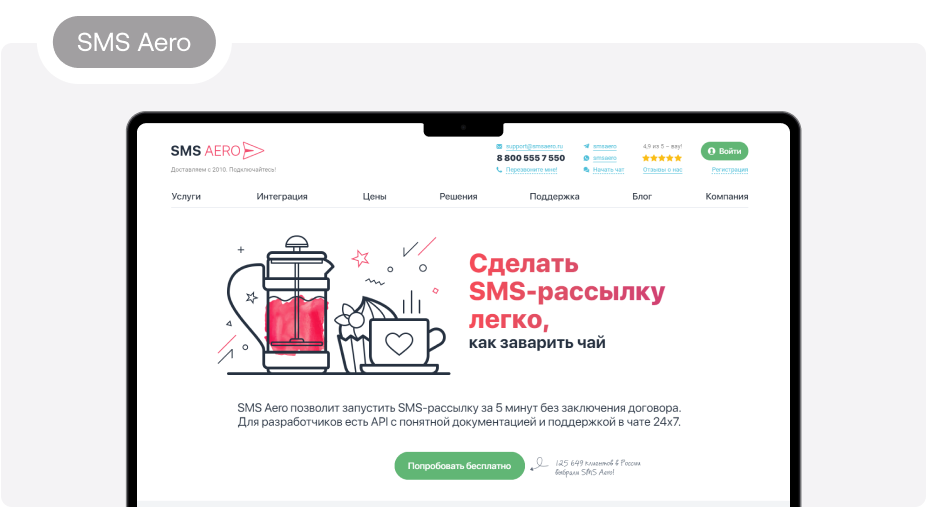 4. SMS Aero. Сервис работает с 2010 года, стоимость SMS — от 1,84 рубля. Уведомления можно рассылать клиентам в разных странах мира, а не только в России. Работает круглосуточная служба поддержки. Клиенты отмечают функциональность сервиса — возможности сегментирования базы, удаления дубликатов, отправки сообщений в определенное время, легкий импорт контактов, готовые решения для разных сфер бизнеса — например, для ритейлеров или интернет-магазинов.