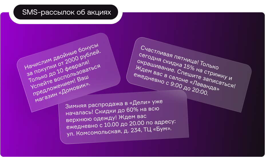 Шаблоны для СМС-рассылок помогают экономить предпринимателям время и деньги. Создать такие тексты-конструкторы можно по самым разным поводам — для приглашения на мероприятия, предложения скидки в обмен на подписку, приветствия клиента после регистрации, уведомления о старте распродаж и не только. Готовые шаблоны можно адаптировать для любой сферы — служба доставки, интернет-магазина, ресторана и т. д.