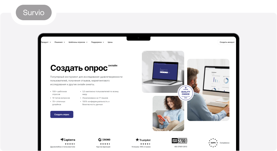 Масштабируемая платформа позволяет создавать небольшие анкеты и развернутые вопросы со сложной логикой. Ее часто используют для проведения крупных маркетинговых и социологических исследований.