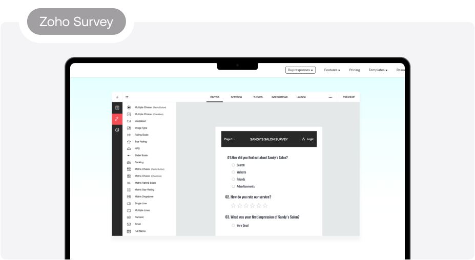 В этой программе можно не только создать опрос, но и произвести посев — распространить анкету среди потенциальных респондентов. Сервис предлагает большое количество шаблонов на разных языках. Результаты выгружаются в Google Sheets или Zoho Sheet. Доступна интеграция с MailChimp, Zoho CRM и SalesIQ. Если требуется защитить ответы от ботов можно подключить капчу.